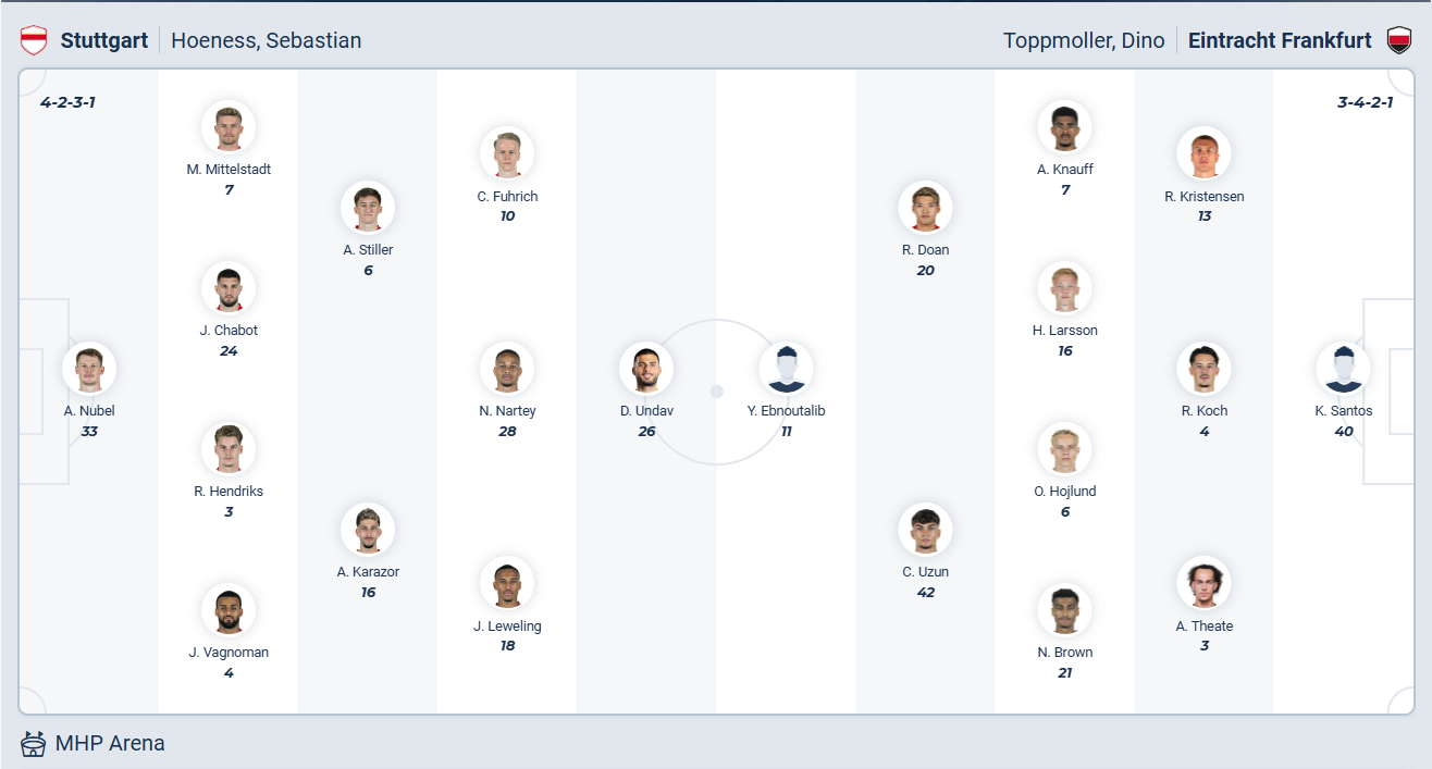 Stuttgart đứng thứ 9 tại Bundesliga mùa trước, rõ ràng họ không phải đội bóng mạnh hàng đầu nhưng cũng không đến nỗi yếu. Mùa giải năm nay đội bóng của HLV Sebastian Hoeneß đã cho thấy sự tiến bộ khi tạm thời đứng thứ 5 sau 16 vòng đấu, 7 điểm có được ở 3 vòng gần nhất giúp họ có được vị trí này và các cầu thủ Stuttgart muốn tiếp tục chơi tốt để ít nhất giữ được vị trí hiện tại. Frankfurt không phải đối thủ quá khó chơi ở thời điểm hiện tại, nhiều khả năng Stuttgart sẽ chơi đủ tốt để có 3 điểm trọn vẹn.