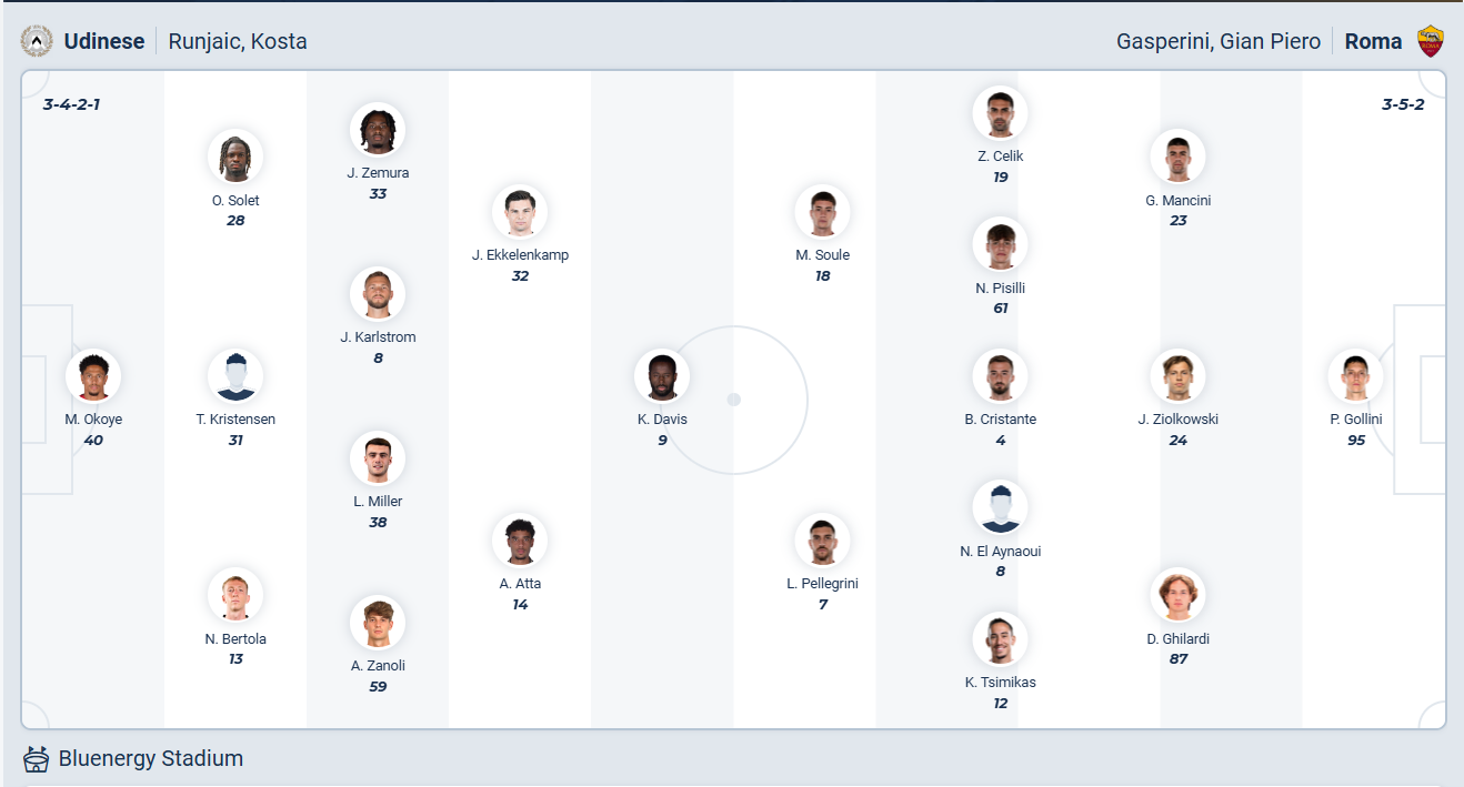 Roma đã từng đứng đầu bảng với chuỗi thắng trận liên tiếp, tuy nhiên chuỗi trận kém cỏi sau đó khiến họ tụt hạng và mất vị trí trong top 4. Đội bóng của HLV Gian Piero Gasperini đã chơi tốt hơn thời gian gần đây khi thắng 3, hòa 1 ở 4 vòng gần nhất để leo lên vị trí thứ 3. Các cầu thủ Roma cần tiếp tục chơi tốt trong các trận đấu tiếp theo để ít nhất giữ vị trí hiện tại của mình. Chính vì vậy Roma cần một chiến thắng khi đến làm khách trên sân của Udinese, nhiều khả năng đội khách sẽ chơi đủ tốt và ra về với 3 điểm trọn vẹn.