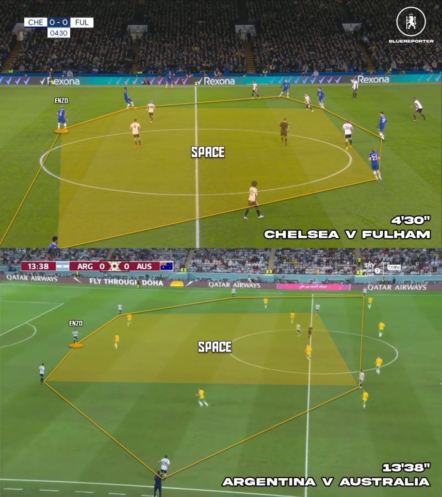 Sau đó, Enzo thường xuyên lùi về giữa hai trung vệ nhằm tạo lợi thế quân số 2v3 trước sức ép từ đội khách. Quyết định này của tiền vệ 21 tuổi vô hình trung tạo ra một khoảng trống rộng lớn giữa tuyến dưới và hàng tiền đạo. Các lựa chọn chuyền bóng theo trục dọc cũng không được tạo ra, khi Enzo chỉ có thể chuyền ngắn cho hai đồng đội ở bên hoặc phất một pha chéo sân cho Ziyech đang ở biên. Và nếu bóng tới chân tiền vệ người Morocco, Enzo cũng không sẵn sàng ở tuyến giữa để liên kết lối chơi vì anh đang ở cùng tuyến giữa và bị cắt hoàn toàn khỏi tình huống tổ chức tấn công.